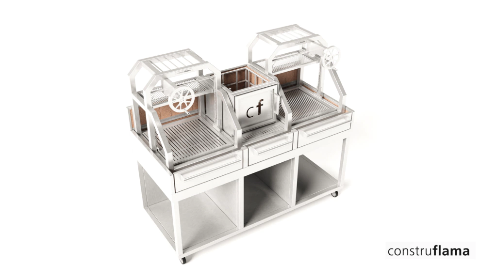Na parrilla profissional, também em aço inox 304 escovado, temos 3 modelos: parrilla cf standard (com a parrilla para inserir em seu braseiro), parrilla cf elite (com braseiro construflama e porta corta fogo), e parrilla cf full (com parrilla, braseiro, porta corta fogo, e base com rodízios).
